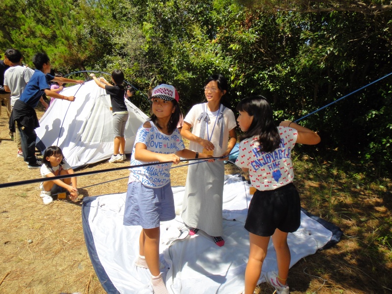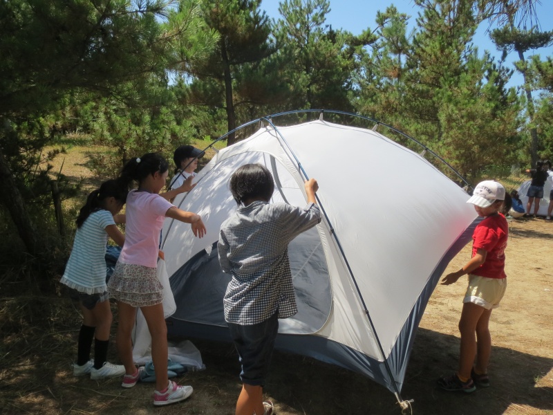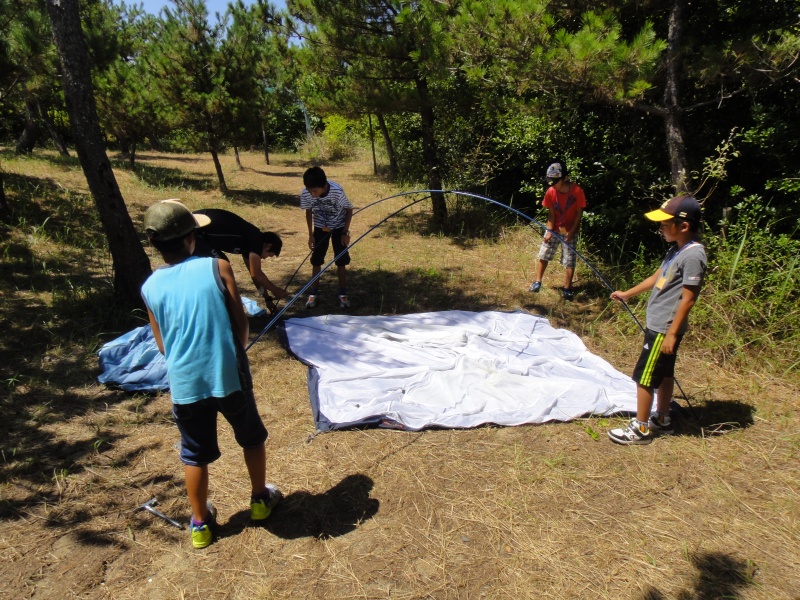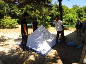 到着後玄海の家の職員さんによる説明を受けた後、すぐにテントの設営に入りました。