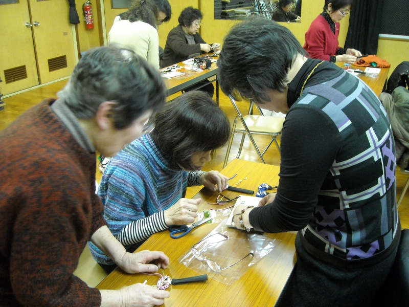 色の付いた糸を編んでいって作るのですが、初めは要領を得ず、