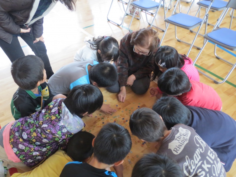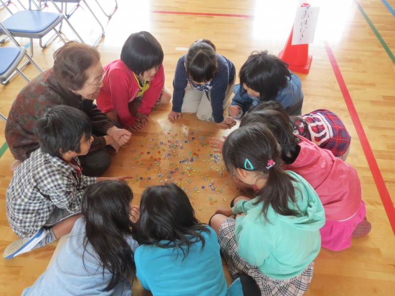 三芳小学校の体育館ではおはじきとお手玉、メンコ、けん玉を