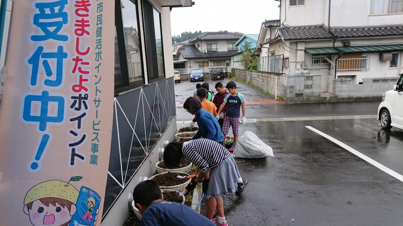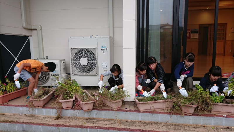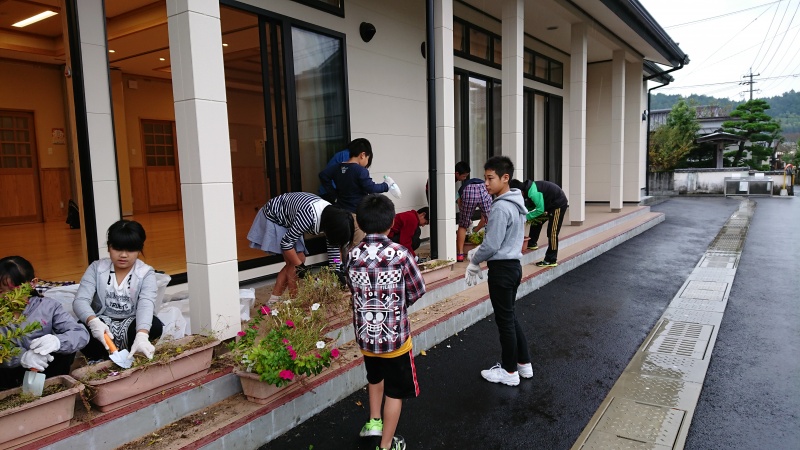 小雨が降る中、コスモスっ子児童のおかげで公民館まわりの花壇がとてもきれいになりました。ぜひ見に来てください♪