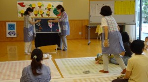 「七夕さま」や「夏の歌」を元気に歌った後は、三芳幼稚園の先生による新聞紙を使ったお話遊びを行いました。
