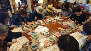 3色の絵の具の色を使っておのおの好きな絵をお皿に描いていきました。