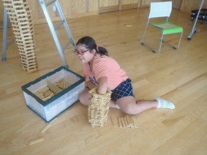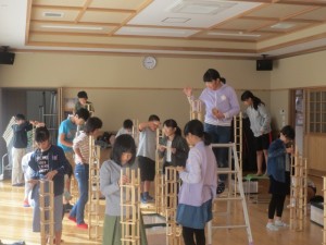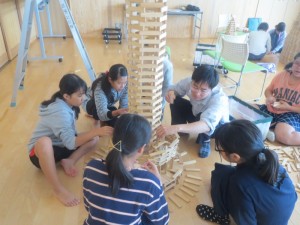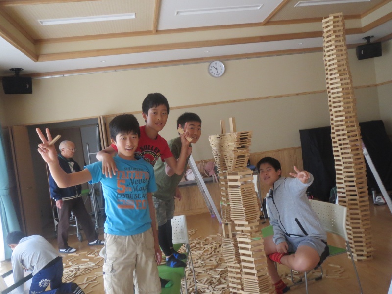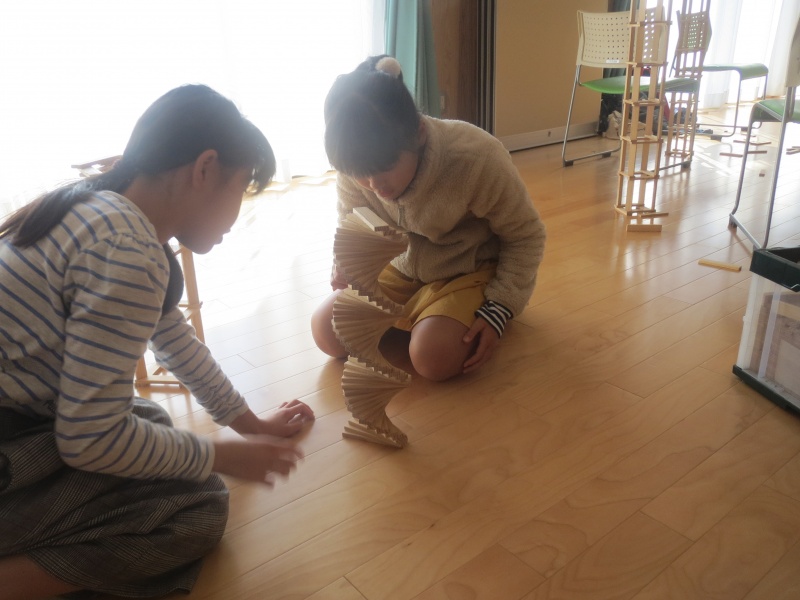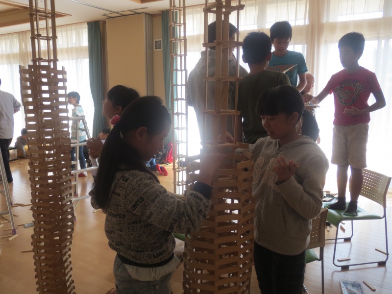 はじめは天井近くまで積み上げ、そこからは各々好きな形を作っていきました。