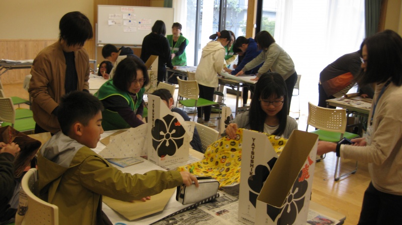それぞれ家庭から持って来ていただいた包装紙で箱を飾り、上手に作り上げることができました。