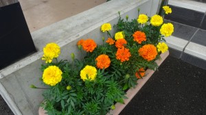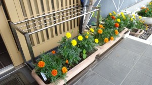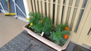 6月3日(土)に「コスモスっ子教室」(三芳小学校4~6年生 21名)で子ども達が植えたマリーゴールドが、玄関で今、見ごろです!!