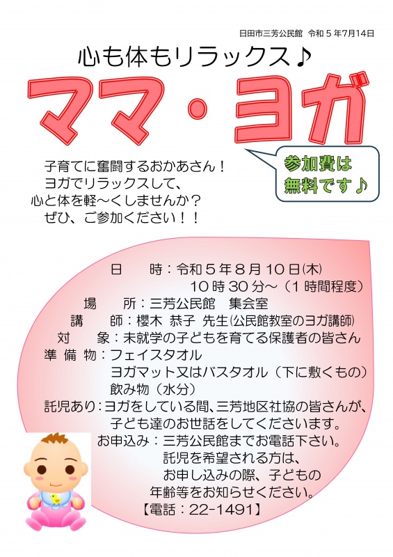 子育て応援講座『ママ・ヨガ』参加者募集中!【R5/8/10】