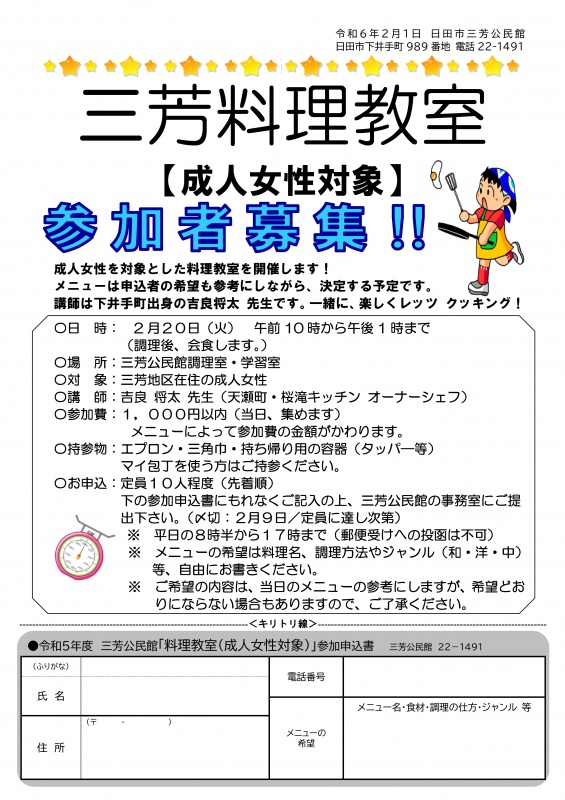 三芳料理教室【成人女性対象】参加者募集!!【R6/2/20】