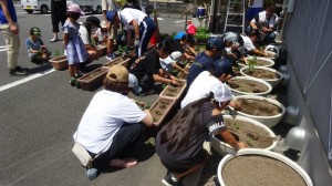 グラウンドゴルフ終了後は公民館に戻って、親子で「サルビアの苗植え」を行いました。