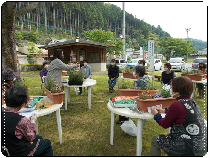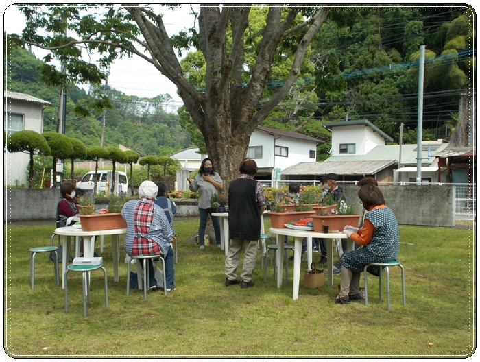 この日、「いろいろチャレンジ&寿学級」第1講を行いました。第1講の講師には、小国町の黒川温泉を主な市場として活躍するゲッセマネガーデン代表の神谷まさみさんにお越しいただき、「薬草&初夏の花」の寄せ植え教室を行いました。