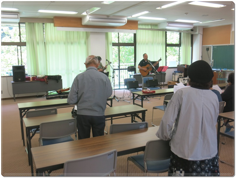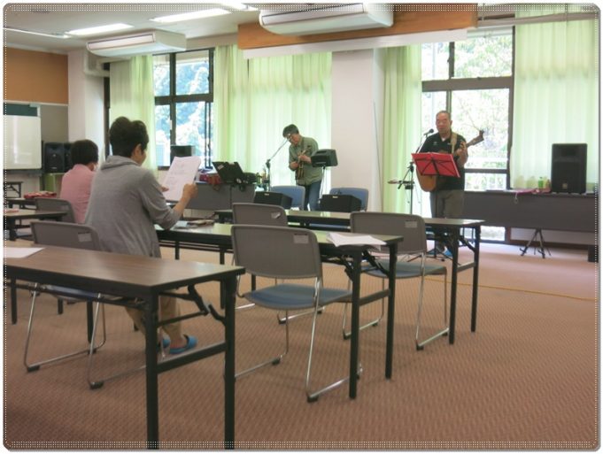 第1回目のゲストティーチャーは前朝日公民館長の赤尾 好一郎さんと歌い手仲間の加藤さん。2人はフォークグループ「シティライツ」を結成していて、本来は3名で活動しているらしいのですが今回はお2人での来館でした。この日は「荒城の月・早春賦・茶摘み・浜辺の歌・上を向いて歩こう」などを受講生の皆さんと熱唱されました。