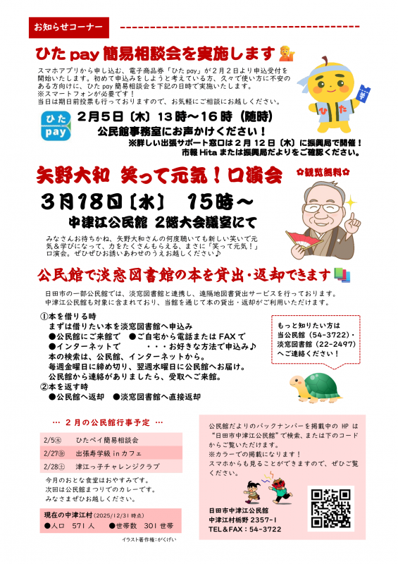 「中津江公民館だより」令和8年2月1日号を発行しました