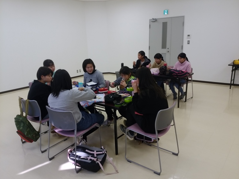 福岡タワーさんのお部屋をお借りして、昼食です。朝早くからお父さん、お母さん達が作ってくれたお弁当、おいしいね。