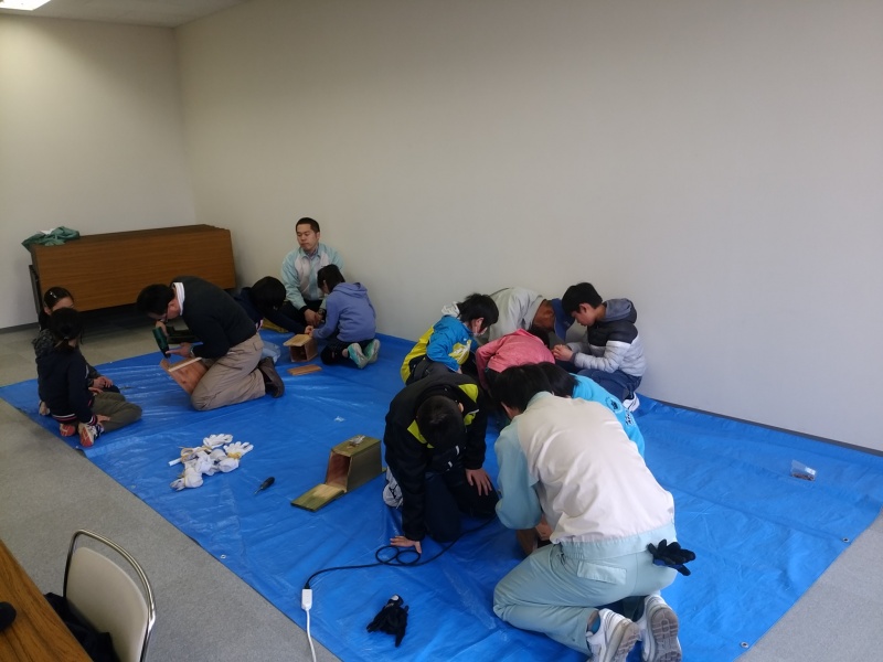 西有田公民館周辺の観察を終えて、いいちこさんに上がってきました。シジュウカラ、ヤマガラが入る巣箱を作っています。
