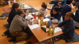の提案を聞きながら、各グループでお弁当を食べながら語り