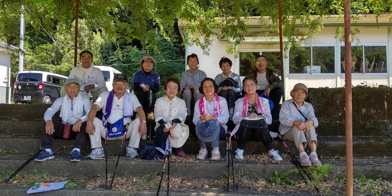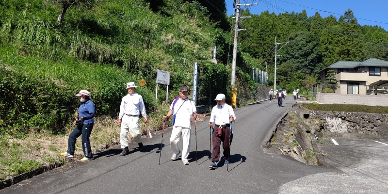 小野地区老人会は、会員の健康増進のためにノルディックポールを各町会用に8組ずつ購入。それを機に自分用に揃えた方も多く、ご持参頂いたり、老人会のポールを借りてきたりして、ポール持参で参加されています。背筋をしゃんと伸ばして、腕を振って歩くので、全身運動が出来ます。