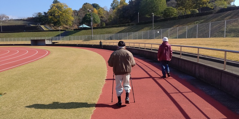 その後、体操して、陸上競技場内に入ってみました。多少滑りやすいことも考えて、コース内は歩かず、競技場内の外周を歩きました。申請した1時間は「貸し切り」のように、ゆっくり歩くことが出来ました。それぞれ自分のペースで歩き、みなさん3周は歩きました。なかには5周歩いた人も!!!