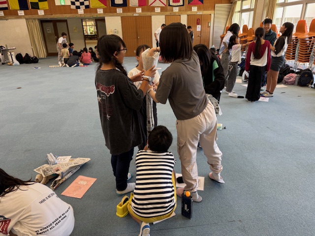 その後は、知恵を出し合い、新聞紙を使ってピンポン球を高い位置にキープするゲームを楽しみました。