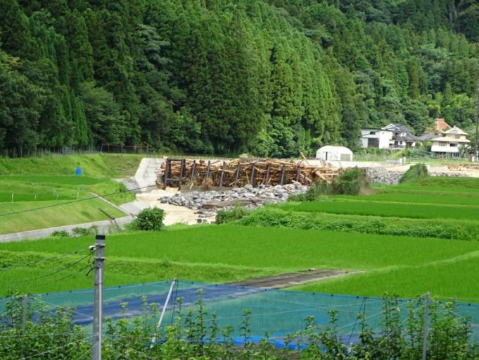 公民館の目の前を流れる小野川の、下流に流れる材を止めるためのスリットがいっぱいになっています。