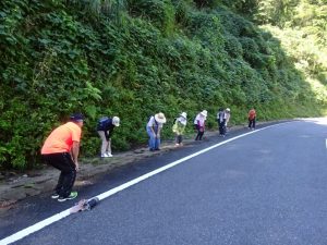 小野公民館から、皿山入口まではバス移動し、準備体操。「続々と車が通る」ということは無いのですが、車道の端なので気を付けながら身体を伸ばします。