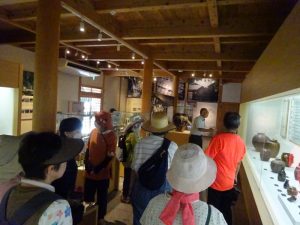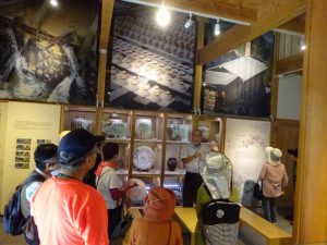 集合場所から、トンネルを抜け、集落に入るまではちょっとした登り坂。 休憩も兼ねて、集落に入ってすぐ小鹿田焼陶芸館に立ち寄りました。そこで、思いがけず陶芸館の館長さんに館内を案内・説明していただくことが出来ました。ここは小鹿田焼の歴史や作品、その手法などを広く紹介している場所です。改めて話を聞く機会を得て、みなさん聞き入っておられました。