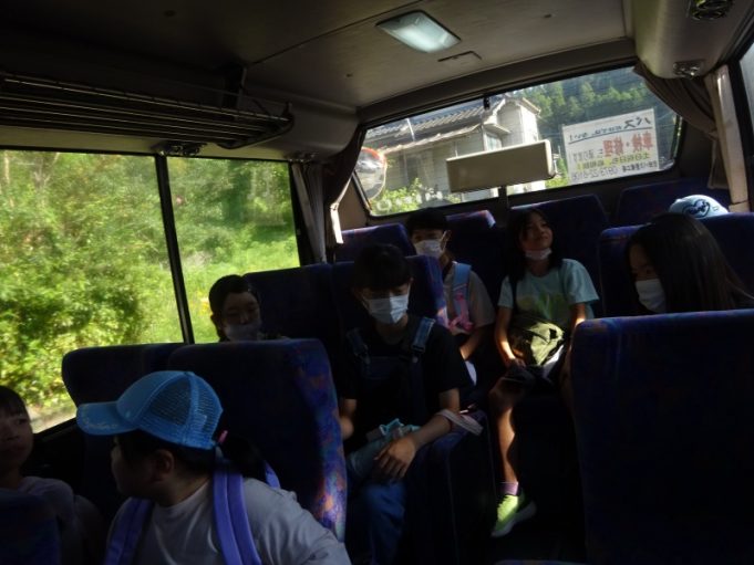 小野地区には日田バスセンターから皿山までの小鹿田線のバスが通っています。公民館から一番近い「下小竹」のバス停から、8時47分発のバスに乗って、まずは日田バスセンターへ向かいます。小鹿田線に乗るのが初めての子がほとんどで、整理券を取ることさえも、うれしそうです。
