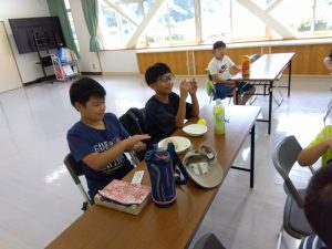 夜明公民館でゴハンを炊いて、おにぎりを作って、昼食! 夜明公民館では、元気いっぱいで、大変お騒がせしました!