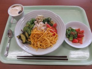 今回は夏にピッタリのメニューで、冷やし中華、トマトとオクラのサラダ、