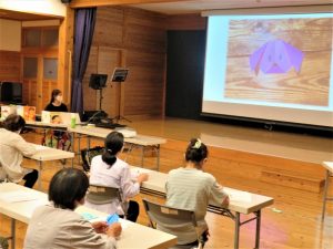 その折り紙を皆さん立って、まずは講師が何を折るかは言わず、約束事(「一度しか言わない」「人と相談しない」「周りを見ない」「一人で折る」等)を決めて言葉で伝え順番に折りました。いろいろな形になり皆さん「もやもや」した気持ちになりました。次にスクリーンを見ながら座って講師の説明を受け折り紙を折りました。(出来上がりは犬でした)