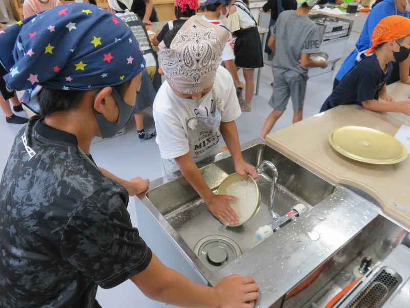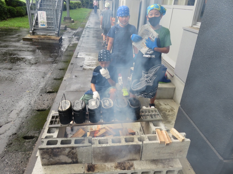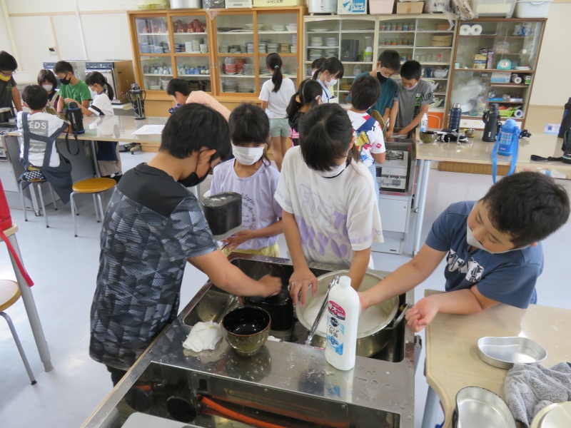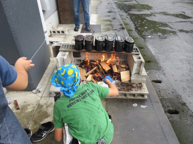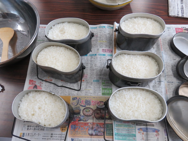 調理室の外では、飯ごうでご飯を炊きます。