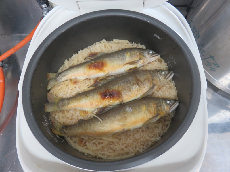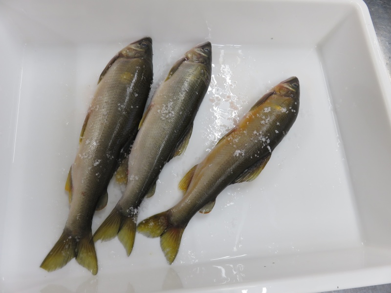 鮎ごはんの鮎は大きめですが、塩を振って焼いて