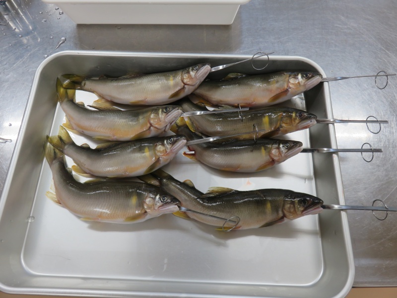 塩焼きは鮎が泳いでいるように串を打ち、化粧塩して下ごしらえ