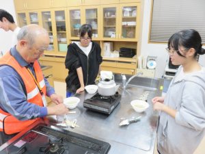 お湯を沸かすところから体験しました。アルファ化米は意外と美味しかったようです。