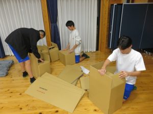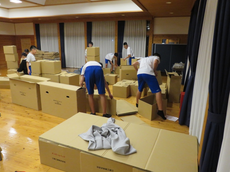 夜は自分たちで段ボールベットを組み立てて、実際に一晩寝ました。
