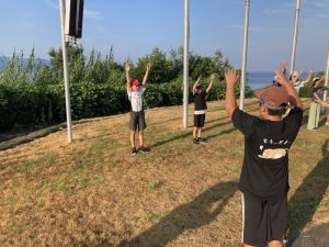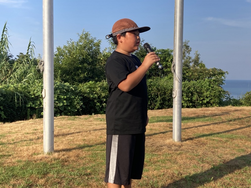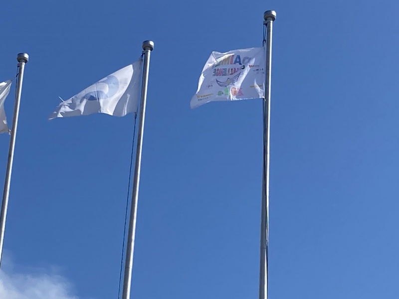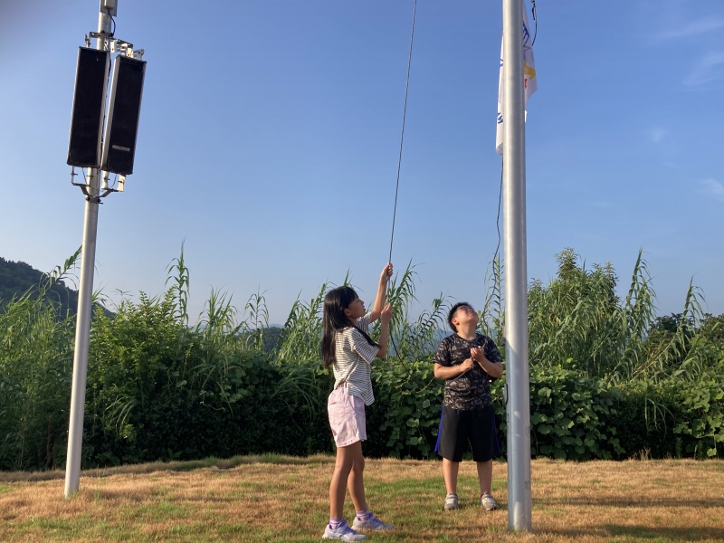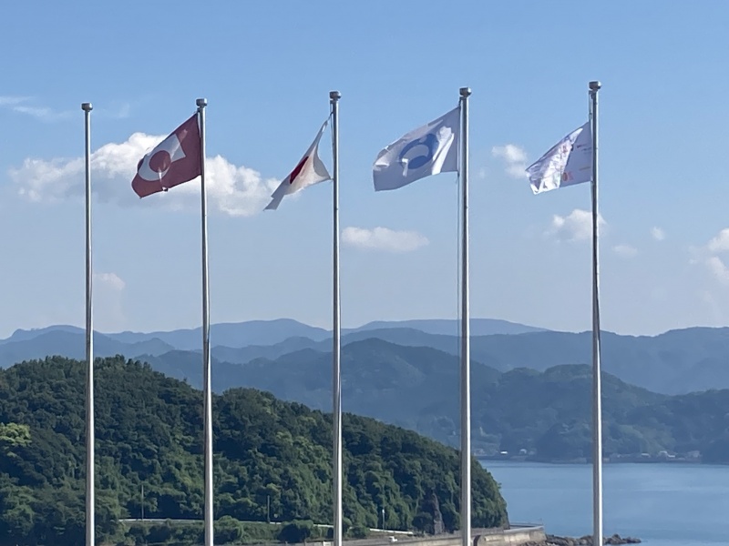 朝のつどいで揚げた大明チャレンジ教室の旗が
