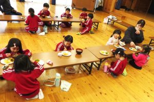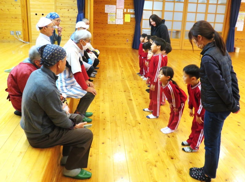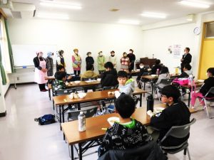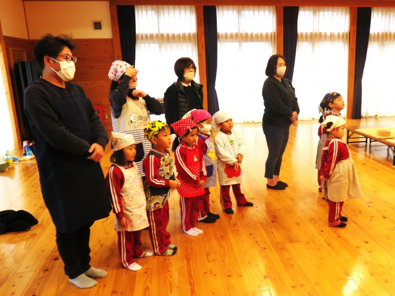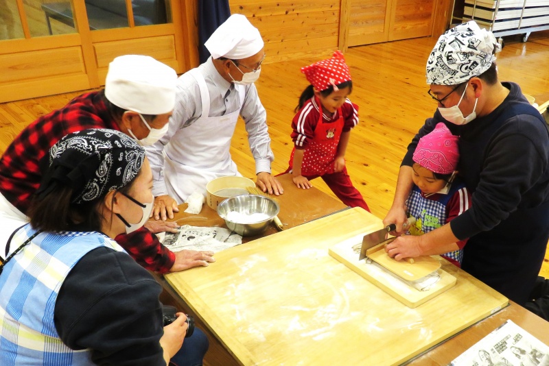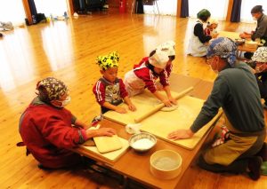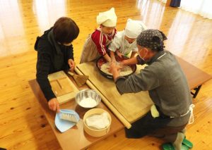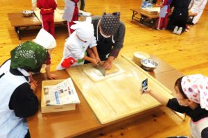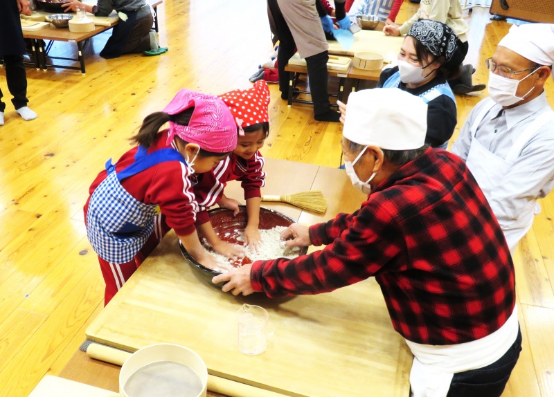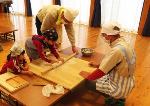 12月18日(月)大鶴公民館まちづくり事業『静修そば打ち道場』で教室生による日頃の学習成果の地域還元を目的とした「白毫こども園児とのそば打ち交流会」を開催しました。