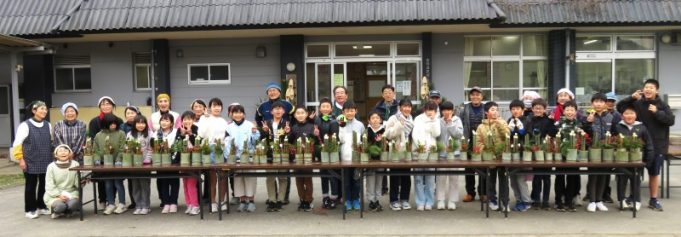出来上がったミニ門松を前にお手伝いいただいた地域の皆さんと一緒に記念撮影をしました。