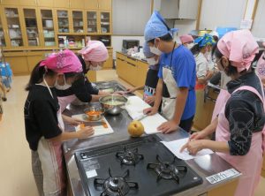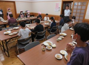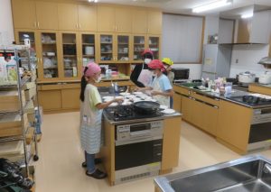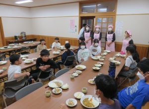 宿題等の学習時間終了後、夕食準備班と入浴班(今回入浴については宝珠山の『いずみ館』を利用しますので、前半組と後半組に分かれて入浴します。)の二班に分かれ活動します。夕飯つくりの班の皆は地元の食推協の皆さんの指導で本日のメニュー「カレーライスとゴマネーズあえ」を作りました。