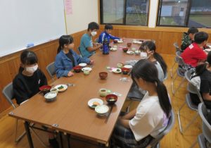 夕食が出来上がるころには前半組の入浴班が帰館し、参加者全員で配膳し夕食を食べました。