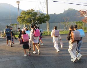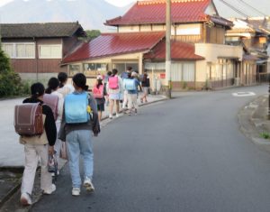 大明児童の通学合宿2日目(19日)は、朝食後7時20分に学校へ元気に出発をしました。