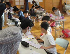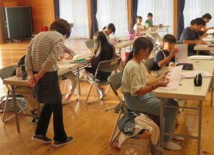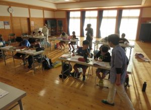 入館式終了後早速宿題等の学習の時間となります。地元の民生委員の皆さんの見守りの中宿題等を行いました。