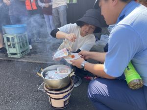 火を起こしてレトルトの豚汁などを温めて食べました。