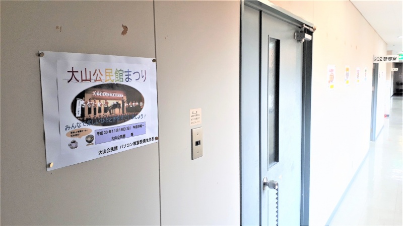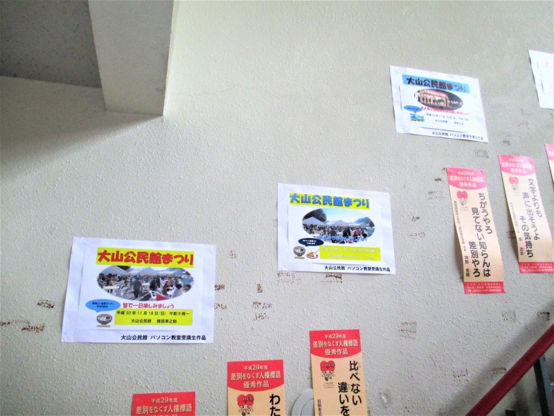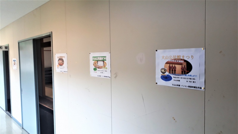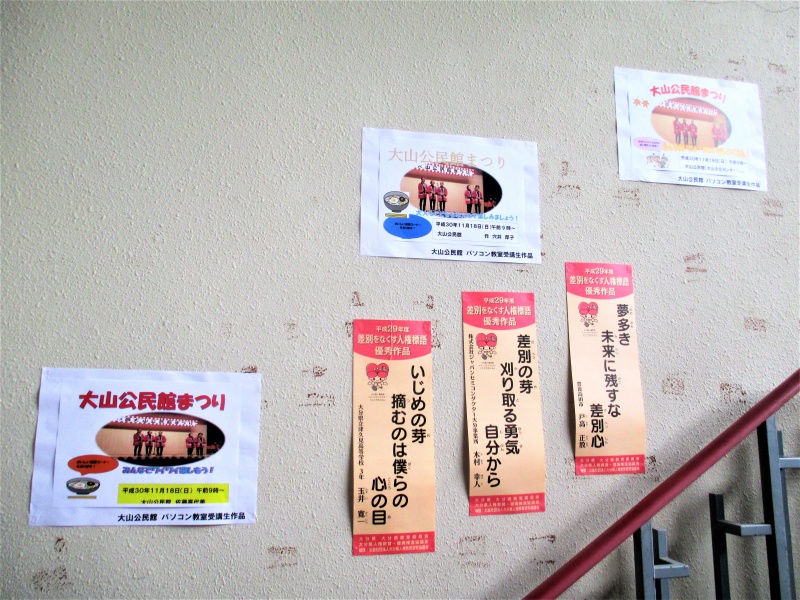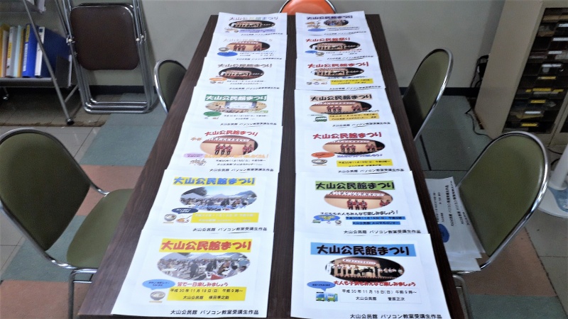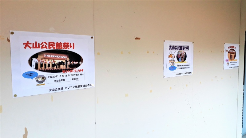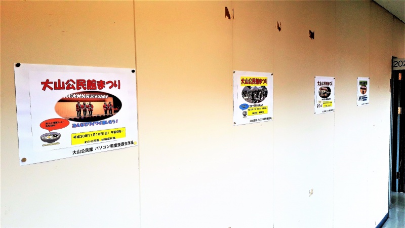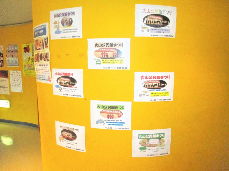 大山公民館で8月27日(月)から31日(金)まで行われた「パソコン教室(ITに触れよう!)」の受講生に作成して頂いた「公民館まつり」のポスターを館内に掲示しています!
