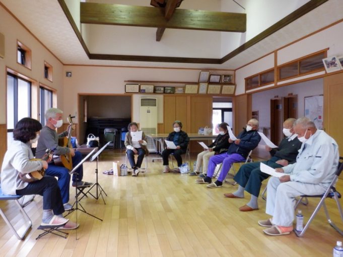 平山さんのギターと、平岡さんのマンドリン演奏にあわせて、唱歌など8曲を合唱しました。