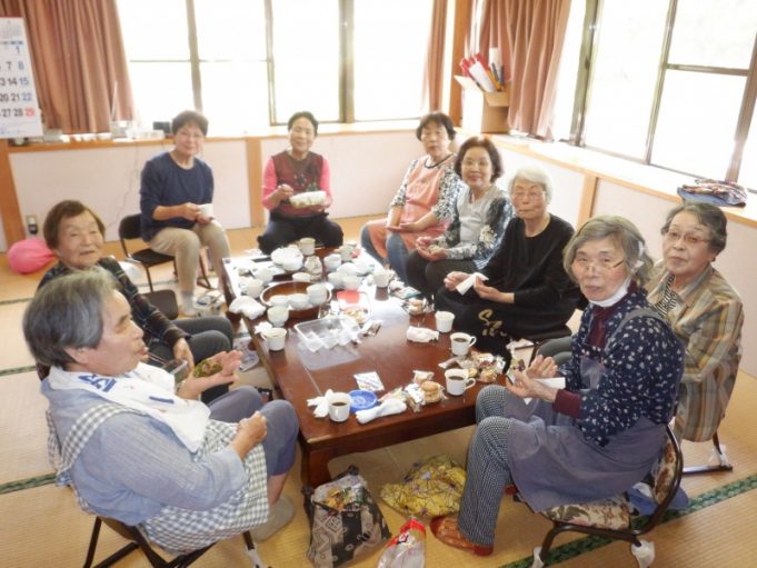 動いた後は、持ち寄ったお茶請けでお楽しみの「お茶」タイム。自分の畑の作物の話から時事ニュースまでおしゃべりが弾みます。
