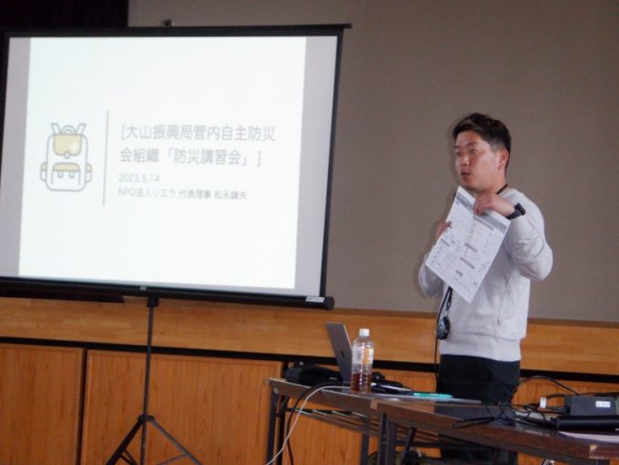 災害時に地域や近隣住民が集まって協力しあいながら防災活動に組織的に取り組む「共助」の重要性から、自主防災組織の充実・活性化を目的とした「防災講習会」が、大山振興局主催で5月14日(日)に大山小中学校体育館で行われました。