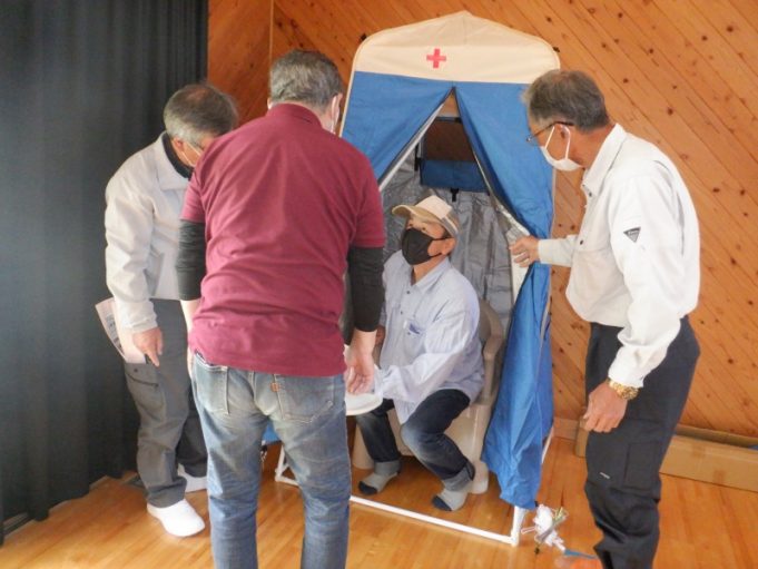 npo法人リエラの体験型防災プログラムを活用しての今回の講習会では、リエラスタッフによるレクチャーを町内自治会長、班長、班員、防災士などが受けました。