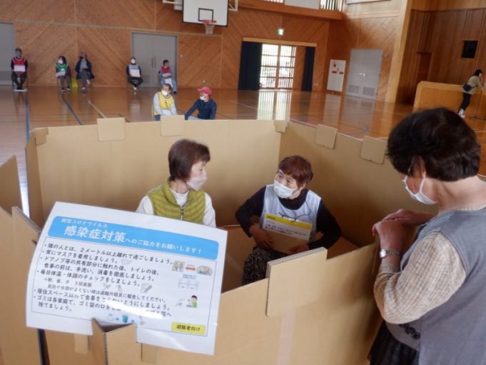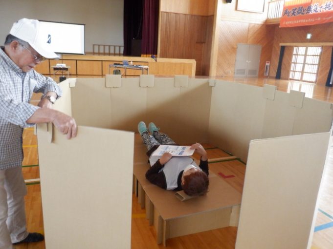避難所運営訓練では「運営役」と「避難者役」に分かれ、避難者は「障がいのある人」「乳児を持つ母親」「発熱のある人」「言葉のわからない外国の人」「常備薬を切らした人」「ペットを連れてきた人」「食物アレルギーの人」などの役になり、運営役はそれぞれのケースに応じて協力しあい対応策を考えました。
