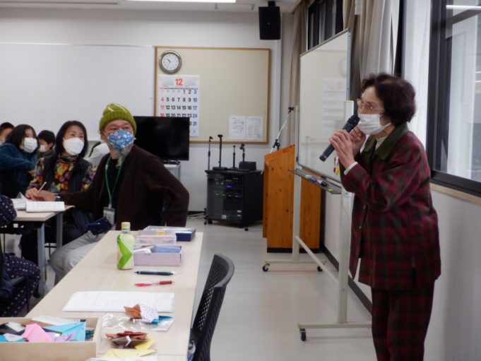2月8日に女性セミナー第8講、手ぬぐいで作る「あずま袋」作りを開催、10名が参加しました。