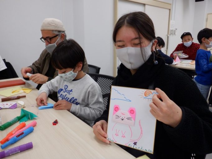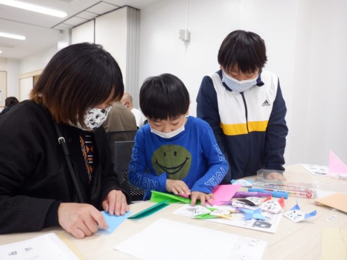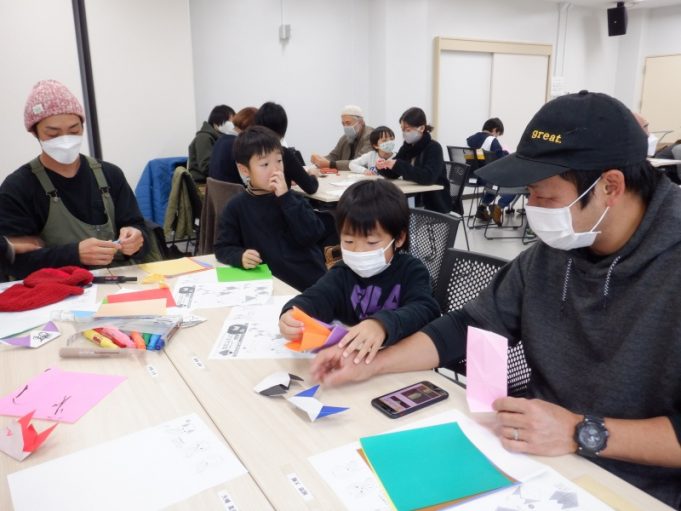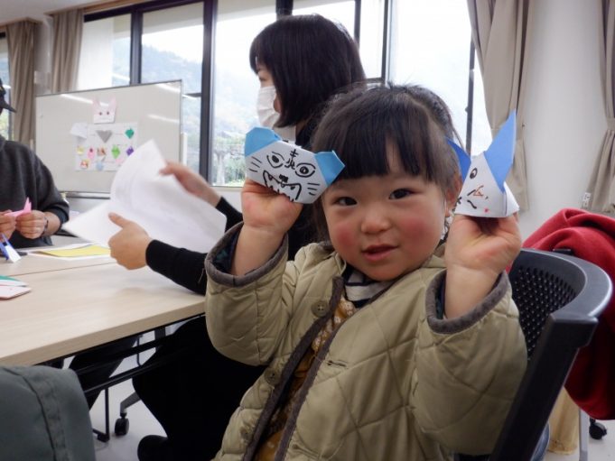 小さいお子さんを持つご家族が多かったので、折り紙のワークショップをしました。指導するのは大山地域住民の江田さんです。