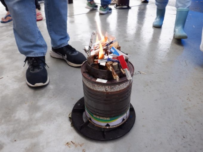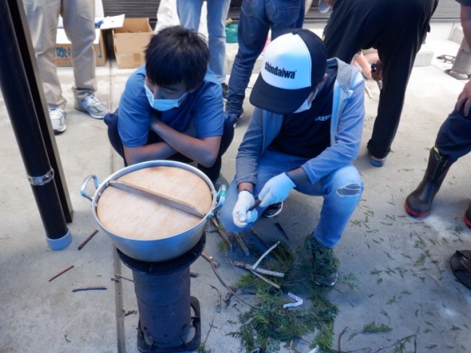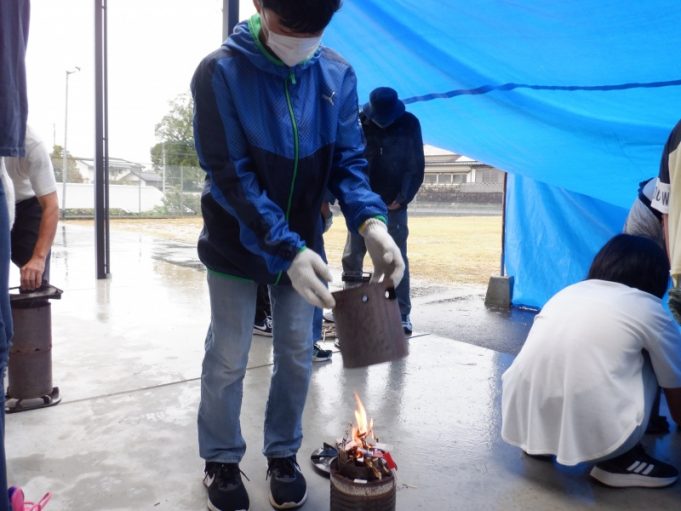 どしゃぶりの雨の中9時30分に活動スタート。都築コミュニティーセンターには軒下があるのでそちらで「小枝ストーブ」を使ったクッキングです。